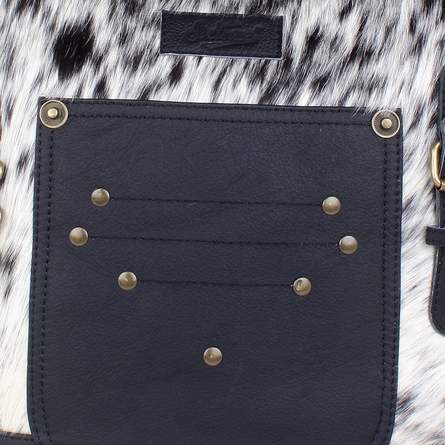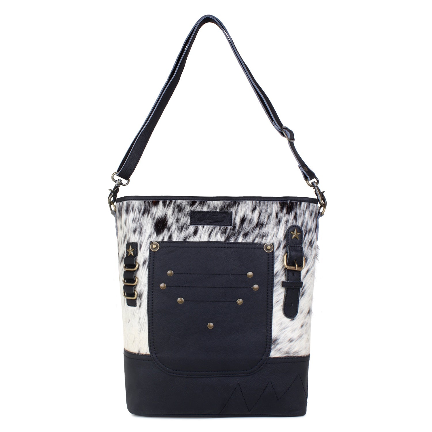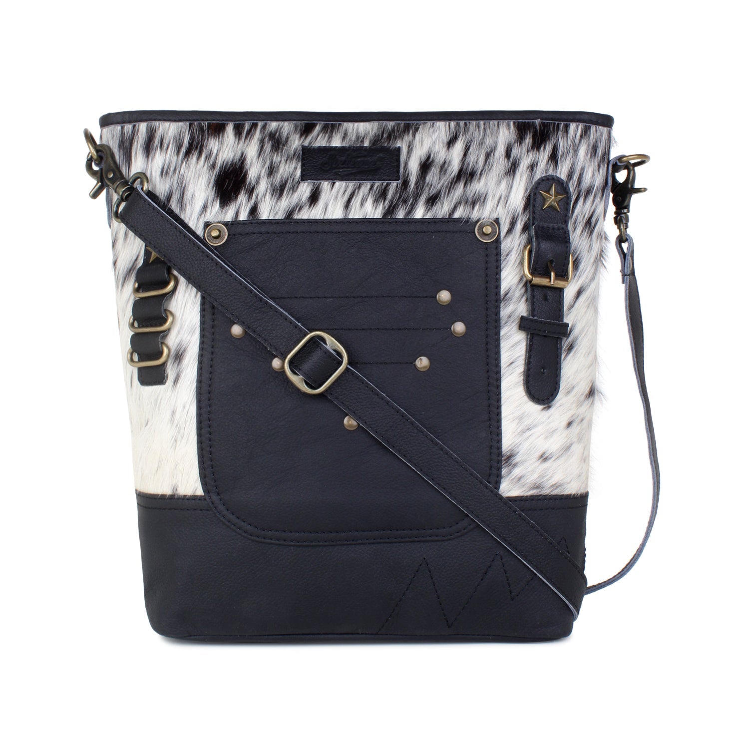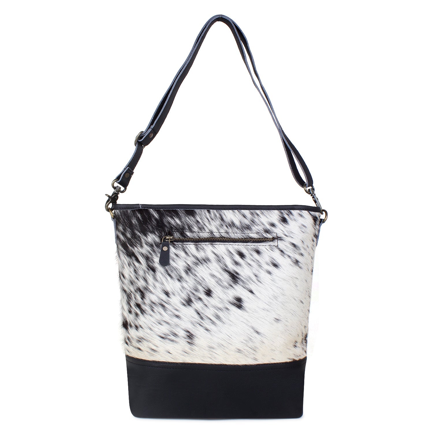 Introducing Sixtease's Leather & Hair Shoulder Bag—where style meets functionality effortlessly. Outside, discover a front slip pocket and a convenient zip pocket at the back. Inside, the main compartment offers one zip pocket and two slip pockets for seamless organization. The poly cotton step logo printed lining adds a touch of sophistication, complementing the antique finish metal fittings. With dimensions of 13 H x 14 W x 4 D inches and a 52" adjustable shoulder strap, it ensures comfortable carrying. Secured with a YKK brass zipper closure, this bag is your perfect companion for everyday adventures. Elevate your style with Sixtease's Shoulder Bag.